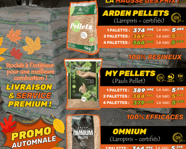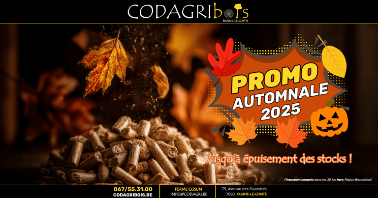 Profitez de nos promotions Automne 2025 sur le bois de chauffage et les pellets chez Codagribois ! Livraison rapide et gratuite*, qualité premium, stock local et service attentif. Réservez votre palette et préparez votre hiver sereinement.